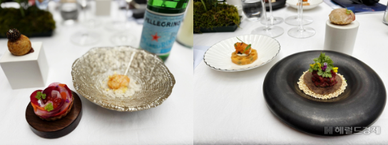 행사의 첫 요리는 셰프 6인이 함께 준비한 음식이었습니다. 셰프들은 한국의 식재료와 이국 소스를 결합했다고 합니다.