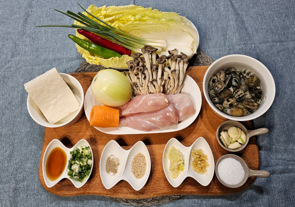 배춧잎 10장, 닭가슴살 300g, 양파 1개, 당근 50g, 느타리버섯 150g, 두부 250g, 홍고추 1/2개, 풋고추 1/2개, 다진 파 20g, 다진 마늘 10g, 다진 생강 5g, 소금 30g, 참기름 20g, 통깨(조금), 후춧가루 약간, 육수(바지락조개 1컵, 물 500ml, 편마늘 20g, 실파 조금
