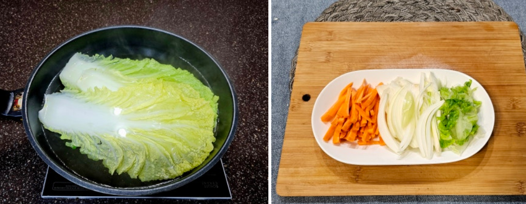 2. 양파와 당근은 채를 썰고 데쳐 놓은 배춧잎도 한 장 굵게 채로 썰어 줍니다.