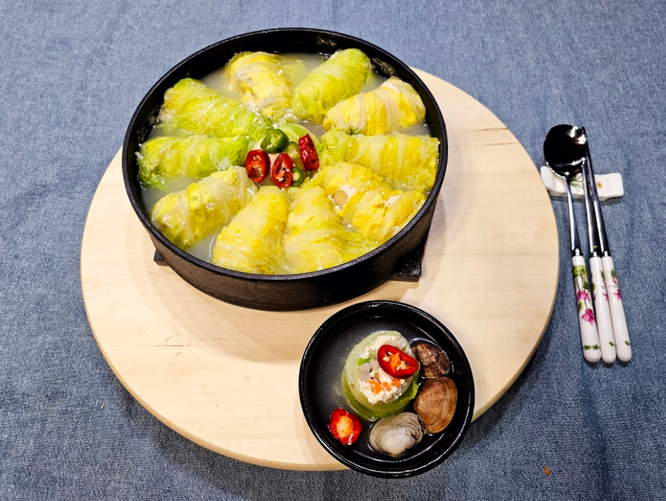 보글보글 배추말이 전골은 시원한 바지락조개의 담백함과 닭가슴살과 채소를 돌돌 말아 끓여 마치 맛있는 배추만두 같습니다.