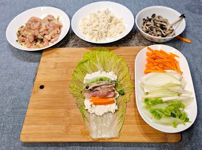6. 이제 준비한 재료를 넣어 배추에 돌돌 말아줍니다. 도마 위에 데친 배춧잎을 넓게 펴고 으깬 두부를 얇게 편 다음 양파, 당근 그리고 닭가슴살과 채를 썬 배추, 느타리버섯을 올리고 동글게 말아 쌈을 싸 줍니다. 완성된 배추쌈을 전골냄비에 예쁘게 돌려 담아줍니다.
