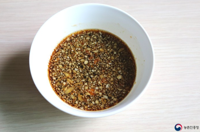 4. 그릇에 양념장 재료(가장 2큰술, 매실청 2큰술, 사과식초 2큰술, 올리고당 1큰술, 다진 마늘 1작은술, 연겨자 1작은술, 창기름 약간)를 넣고 고루 섞어줍니다.