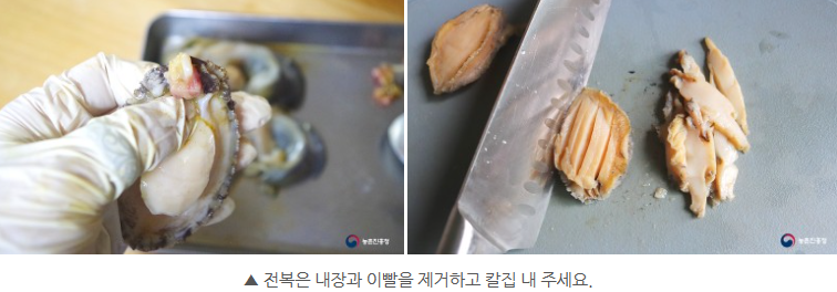 2. 깨끗이 씻은 전복 3개는 내장과 이빨을 제거하고 칼집 내줍니다.