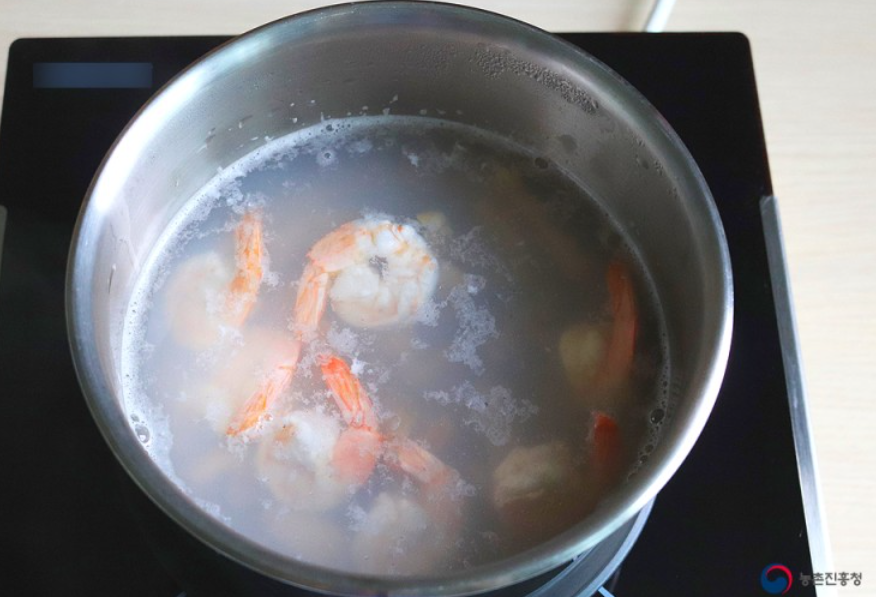 3. 칵테일 새우 8마리와 손질한 전복을 끓는 물에 2분간 데쳐줍니다. 그다음, 체에 밭쳐 물기를 제거해 줍니다.