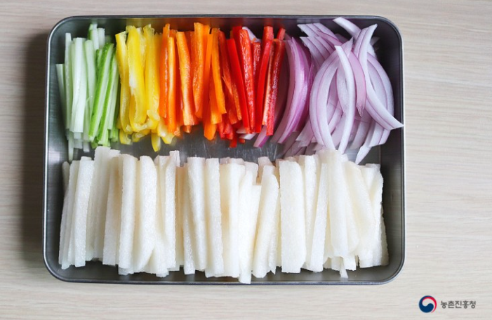 1.  배 1개를 비롯해 오이 1/4개 파프리카 3개, 자색 양파 1/4개는 약 6cm 길이, 0.3~0.5cm 두께로 채 썰어 준비해 줍니다.