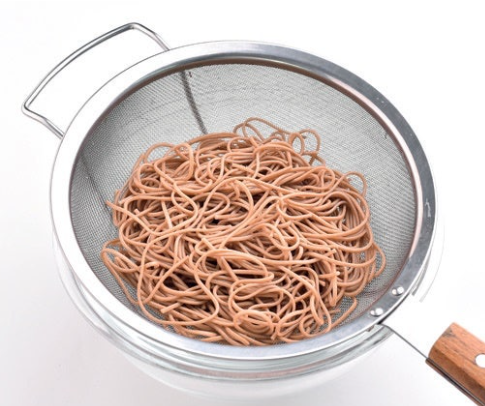 2. 끓는 물에 메밀면을 넣고 4~5분간 삶은 뒤 체에 밭쳐 찬물에 헹굽니다.