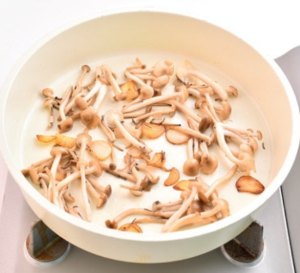 3. 중불로 달군 팬에 식용유 1T를 두른 뒤 느티 만가닥버섯과 마늘을 넣고 노릇하게 볶아줍니다.