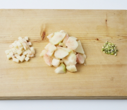 1. 복숭아 1개는 껍질을 제거해 규브 모양으로 다지고, 나머지 2개는 큼직하게 썰고, 피스타치오는 잘게 다집니다.