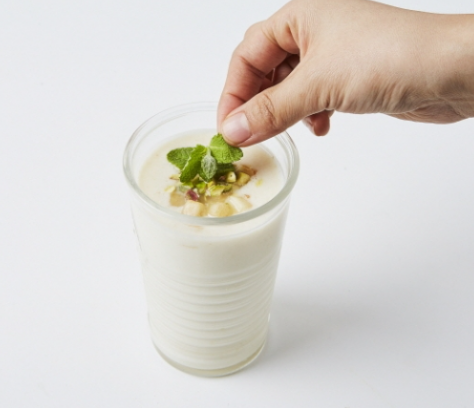 4. 컵에 부어 다진 복숭아, 피스타치오, 애플민트를 올려 마무리합니다.