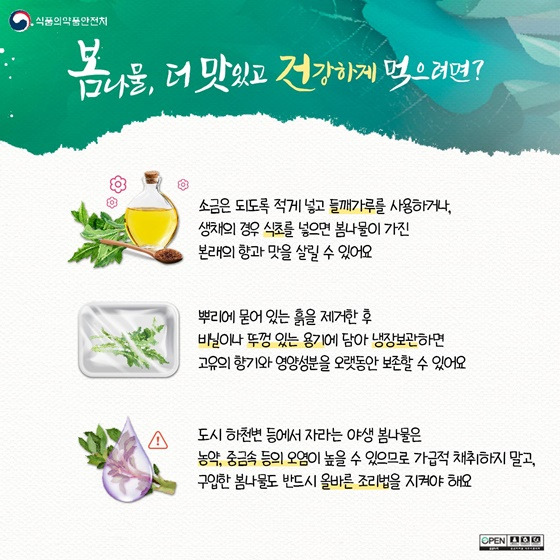 ✔ 도시 하천변 등에서 자라는 야생 봄나물은 농약, 중금속 등의 오염이 높을 수 있으므로 가급적 채취하지 말고, 구입한 봄나물도 반드시 올바른 조리법을 지켜야 합니다.