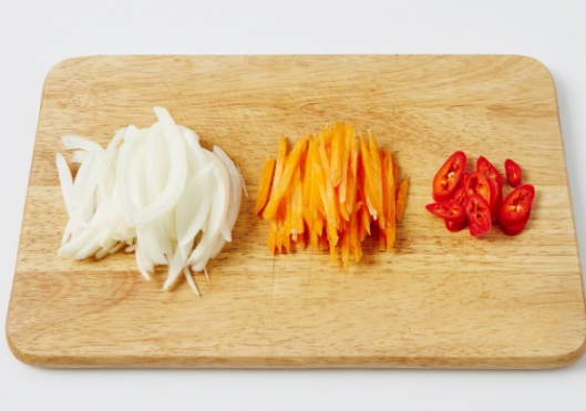 2. 양파와 당근은 채 썰고, 홍고추는 어슷 썰어줍니다.