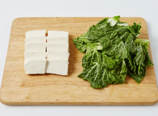 1. 두부는 도톰하게 납잡 썰고, 봄동도 비슷한 크기로 썰어줍니다.