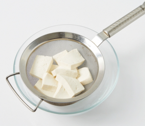 3. 끓는 물 3컵에 소금과 두부를 넣어 15초간 데쳐 건집니다.