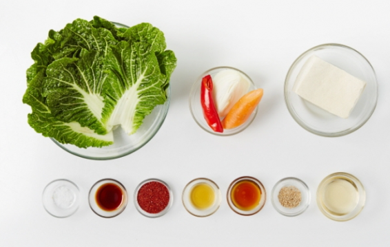 두부 1/2모(145g), 봄동 1/2포기(120g), 양파 1/4개, 당근 1/6개, 홍고추 1/2개, 소금 1/4t, 양념장(고춧가루 1T, 간장 1/2T, 액젓 1/2T, 매실액 2T, 참기름 1T, 참깨 약간