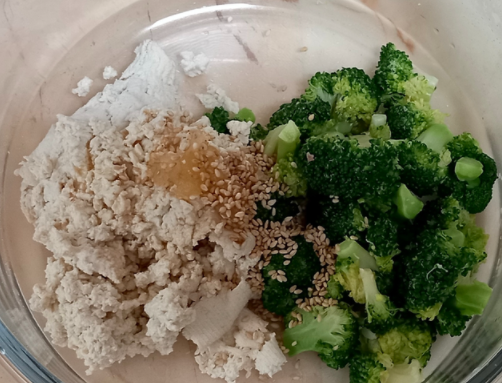 6. 큰 볼에 으깬 두부, 데친 브로콜리, 다진 마늘 반 스푼, 국간장 한 스푼, 참기름 한 스푼, 깨소금 한 꼬집, 소금 한 꼬집을 넣고 무쳐줍니다.