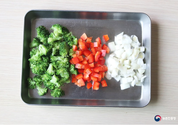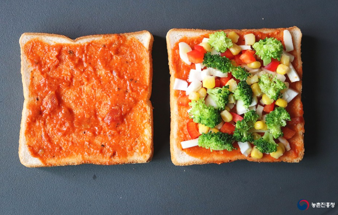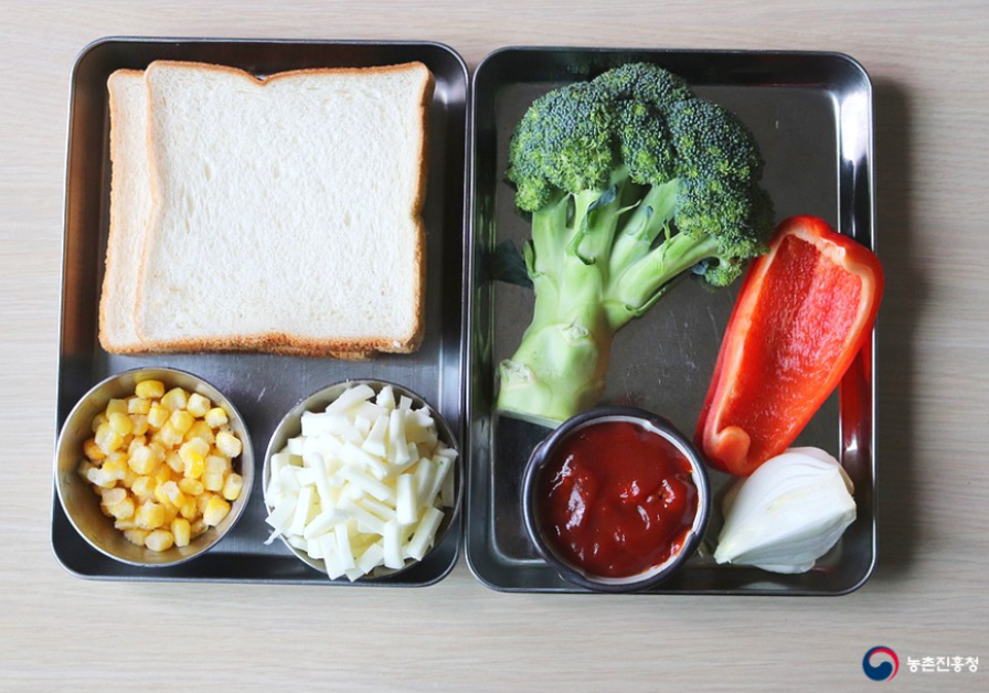 식빵 2장, 브로콜리 70g, 파프리카 1/4개, 캔옥수수 2큰술, 피자치즈 1/2컵, 피자소스 2큰술, 소금 1작은술, 파슬리가루 약간