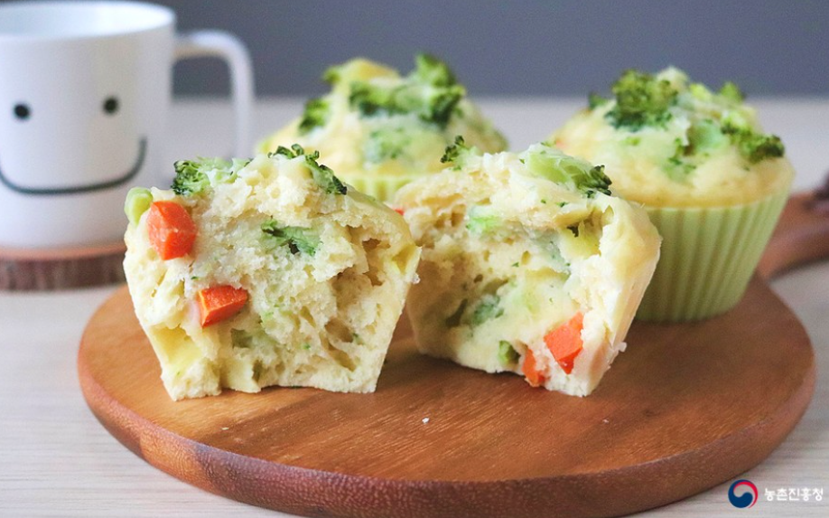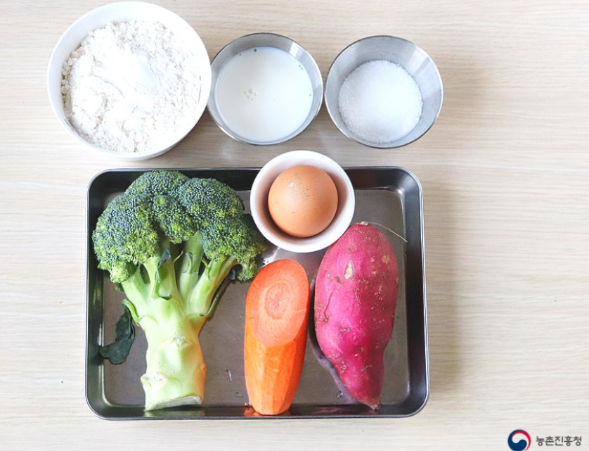 브로콜리 100g, 당근 1/3개, 고구마 1/2개, 박력분 100g, 베이킹파우더 1작은술, 계란 1개, 설탕 1.5큰술, 식용유 1큰술, 우유 3큰술
