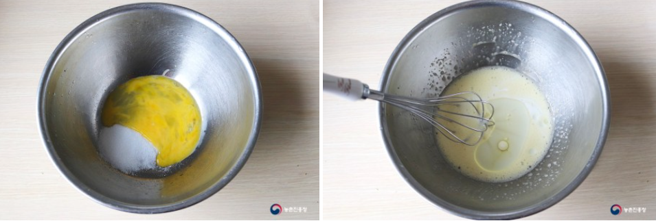 4. 큰 볼에 설탕 1.5큰술과 달걀 1개를 넣고 녹을 때까지 거품기로 적어줍니다. 식용유 1큰술과 우유 3큰술을 추가로 넣고 섞어줍니다.