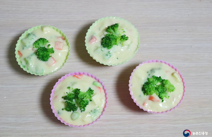 7. 찜용 그릇이나 실리콘 머핀컵에 반죽을 담은 다음, 고명으로 브로콜리를 얹어줍니다.