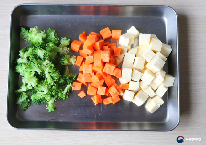 3. 당근 1/3개와 고구마 1/2개는 약 1cm 크기의 작은 큐브 모양으로 손질해 줍니다.