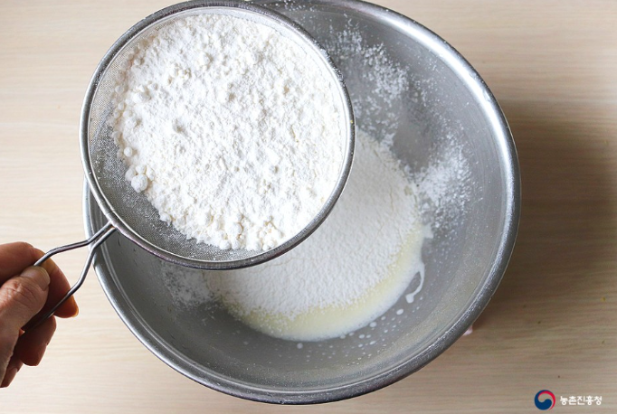 5. 박력분 100g과 베이킹파우더 1작은술을 체에 걸러 내리고 부드럽게 섞어줍니다.