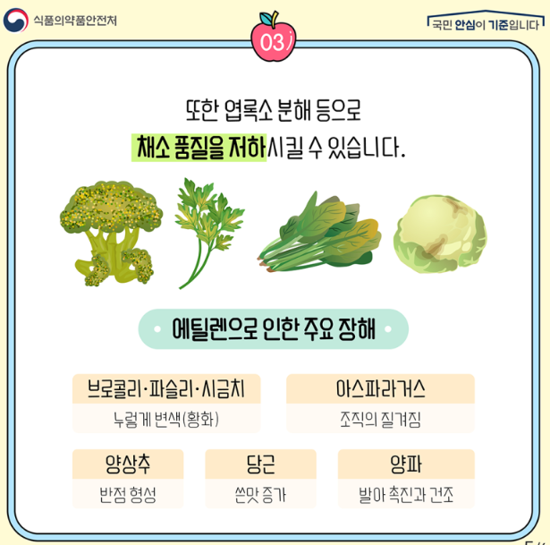 또한, 엽록소 분해 등으로 채소의 품질을 저하시킬 수 있습니다.