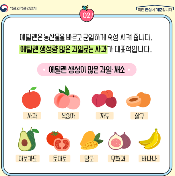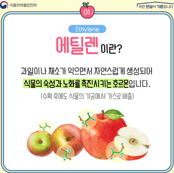 에틸렌(Ethyleme)은 과일이나 채소가 익으면서 자연스럽게 생성되어 식물의 숙성과 노화를 촉진시키는 호르몬입니다.(수확 후에도 식물의 기공에서 가스로 배출)