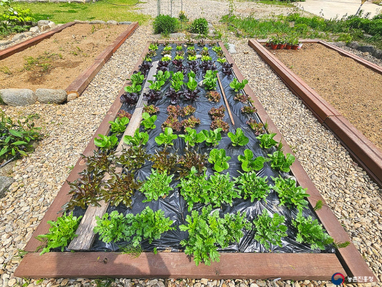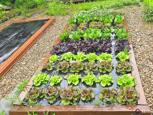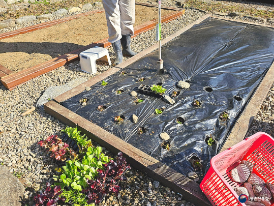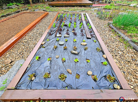 서늘한 기후를 좋아해 서리에 꽁꽁 언 듯 보여도 금방 녹으며 잘 자랍니다. 집 잎 작은 텃밭에 퇴비를 뿌리고 비닐을 씌워 상추 모종을 심을 자리를 준비합니다.
