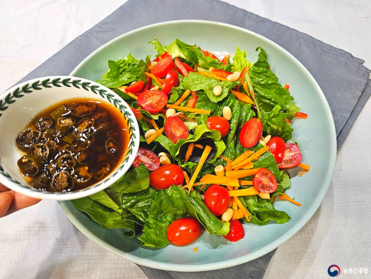고추 간장 장아찌로 드레싱을 만들면 더욱 새콤달콤합니다. 상추의 아삭아삭한 식감이 살아있어 더욱 신선하게 느껴집니다.