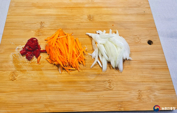 3. 양파 1/4개와 당근 1/6개는 곱게 채 썰고 홍고추 1개는 반으로 갈라 씨를 제거한 후 송송 썰어줍니다.