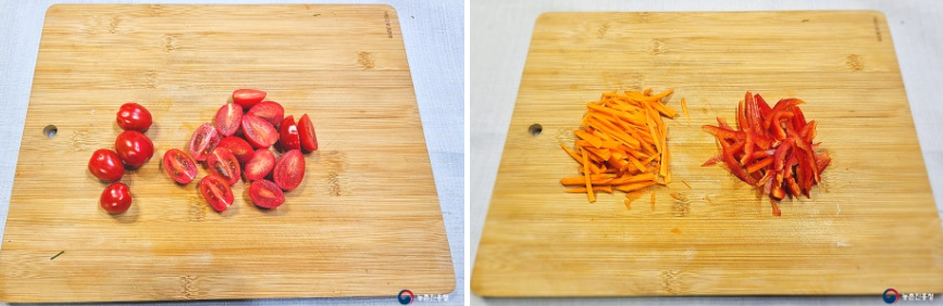 2. 방울토마토 10개는 반으로 잘라 준비해 줍니다. 빨강 파프리카 1/4개와 당근 1/4개는 곱게 채 썰어줍니다.