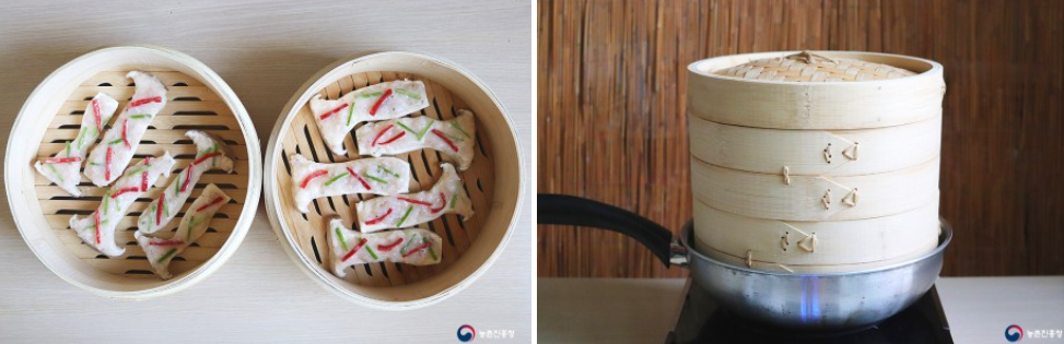 6. 찜통에 적당 간격으로 담아준 후, 중 약불에서 5분간 쪄줍니다.