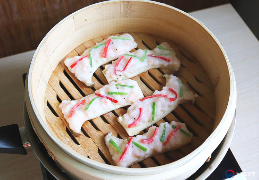 새송이버섯의 쫄깃함과 새우의 탱글함이 살아있습니다. 홍고추, 청고추가 화려함을 더해 입과 눈 모두 즐거운 음식으로 탄생합니다. 새송이버섯을 찌니 씹을 때마다 오독거리는 식감과 소리가 더욱 즐겁게 들리고 살짝 달큼한 새우가 감칠맛을 더해줍니다. 가을 제철 식재료인 버섯과 새우가 만나 건강까지 확실히 책임져줄 것입니다.