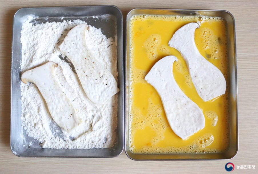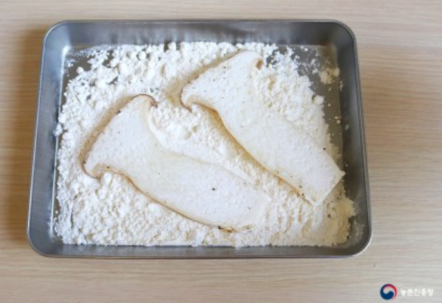 3. 밀가루 1/2컵을 새송이버섯 앞뒤로 고루 묻히고 겉에 묻은 밀가루는 살짝 털어내줍니다. 그다음, 달걀 2개를 풀어 고루 묻혀줍니다.