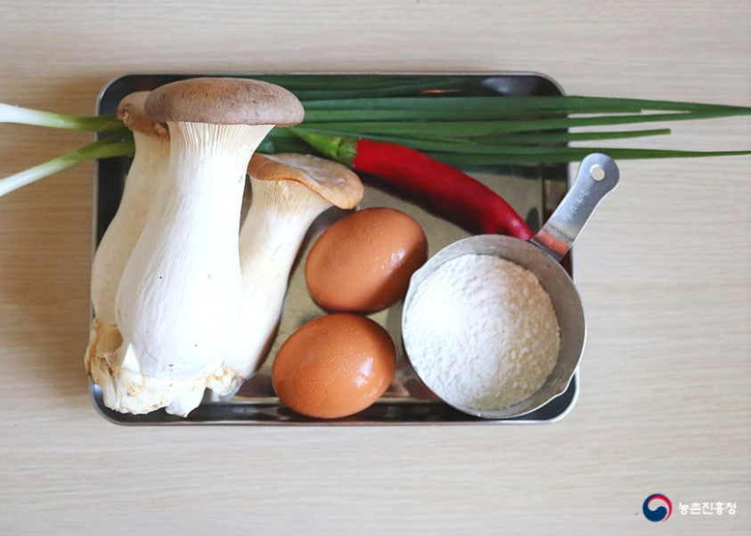 새송이버섯 3개, 달걀 2개, 밀가루 1/2컵, 쪽파 2줄기, 홍고추 1개, 소금, 후추 약간