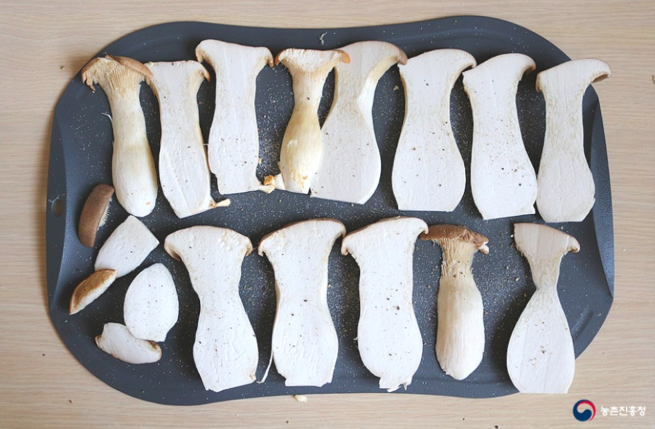 2. 새송이버섯을 넓게 펼치고 앞뒤로 소금, 후추를 뿌려 밑간해 줍니다.