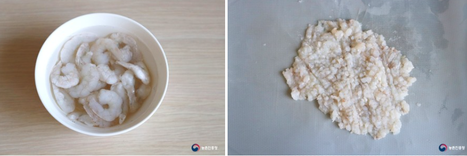 1. 냉동 칵테일새우를 찬물에 10여 분 담가 해동한 후, 종이행주를 이용해 물기를 닦고 칼로 곱게 다져줍니다.