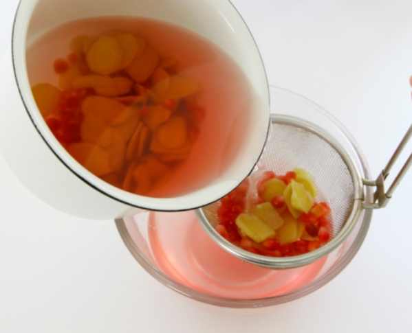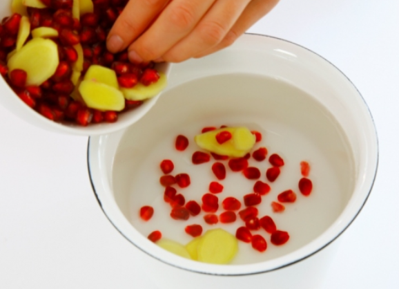 3. 다른 냄비에서 저민 생강과 석류 알맹이를 넣고 물 10컵과 함께 중불에서 끓입니다. 끓어오르면 약불에서 30분 동안 끓입니다.