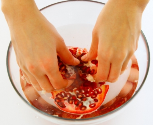 1. 생강은 껍질을 벗겨 얇게 저미고 석류를 4등분을 한 후 물이 담긴 볼에 담가 껍질을 벗겨 과피를 제거하고 알맹이를 분리합니다.