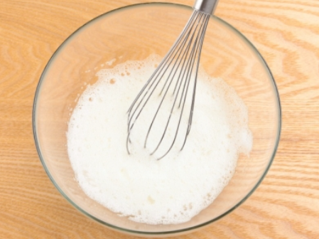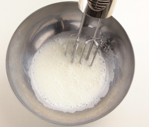 3. ②에 레몬즙을 넣고 핸드믹서 또는 거품기로 단단하게 거품을 만듭니다.