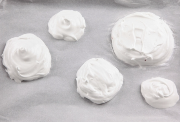 5. 유산지에 지름 10cm정도 원을 만들어 뒤집고, 그 안에 머랭을 잘 펴 바른 다음, 오븐에 40분 동안 굽습니다.