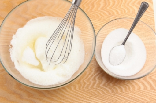 2. 달걀흰자 거품에 설탕이 잘 녹을 수 있도록 1큰술씩 넣어가며 젓습니다.