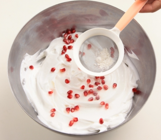 4. 단단해진 머랭 위에 전분을 채에 쳐 뿌린 후, 석류알 20~30개 가량 넣은 뒤, 머랭의 부피가 줄지 않도록 조심스럽게 잘 섞어줍니다.