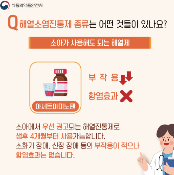 소아에게 우선 권고되는 해열진통제로 생후 4개월부터 사용 가능합니다. 소화기 장애, 신장 장애 등의 부작용이 적으나, 항염효과는 없습니다.