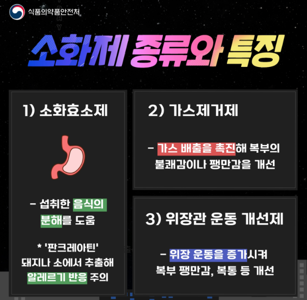 섭취한 음식의 분해를 돕는 소화효소제는 각 성분에 따라 적용하는 기관과 분해하는 영양소가 다릅니다. 소화효소제에 따라 여러 가지 영양소에 작용할 수 있어 여러 종류의 소화제와 함께 복합제로 주로 사용됩니다. 효소제 중 '판크레아틴'은 주로 돼지나 소에서 추출해 알레르기 반응이 있는 사람은 주의해야 합니다.