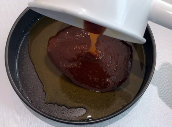 3. 준비한 23cm 지름의 둥근 케이크를 카라멜을 붓습니다.