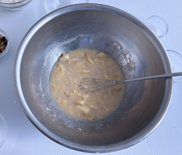 1. 바나나케이크용 재료를 볼에 넣고 핸드볼렌더로 섞은 후 오븐을 180도로 예열합니다.
