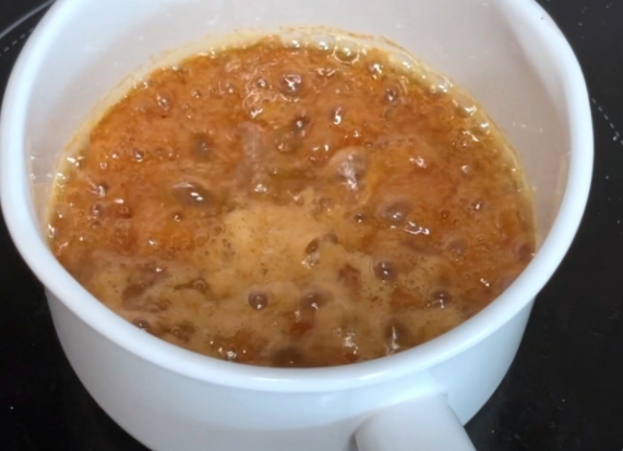 2. 솔티드카라멜을 만들기 위해 소스팬에 재료를 넣고 중불에서 데운 후, 소금을 섞어줍니다.