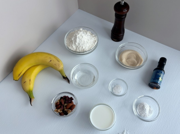바나나케이 : (잘 익은 바나나 4~5개(으깬 양으로 1/2컵), 코코넛 오일 1/3컵, 원당 3/4컵, 바닐라 엑스트렉 1½ 작은술, 베이킹파우더 1작은술, 베이킹소다 1작은술, 소금 1/4작은술, 시나몬파워더 1/2작은술, 생강가루 1/2작은술, 밀가루 2컵