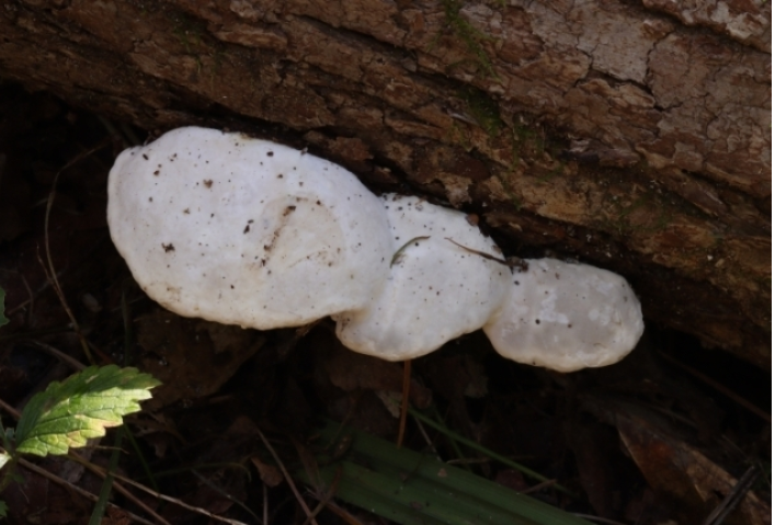 송편버섯 북한명은 흰색향조개버섯이라고 합니다. 봄부터 가을까지 죽은 활엽수에 무리를 지어 자라거나 한 개씩 자라기도 한다고 합니다. 버섯갓은 3~7x3~12x1~3cm이며 가운데가 봉긋한 반원 모양이고 기와처럼 배열되어 있다고 합니다. 갓 표면은 흰색, 회색, 누른색이며 부드러운 털이 덮인 것도 있고 덮이지 않은 것도 있다고 합니다. 살은 두께가 0.5~2cm인 코르크질이며 흰색 또는 누른색이라고 합니다.